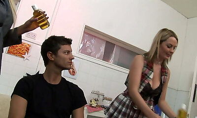Gorgeous and busty platinum-blonde babe fucked hard by young sex slave